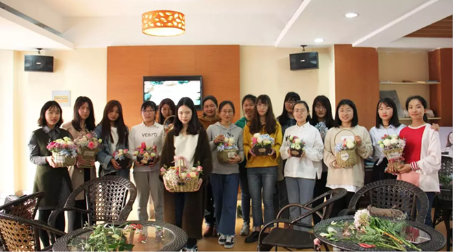 插花结束后,各小组分享感受。机械学院郏若男同学谈到,自己在插花过程中并未可以追求美感,而是尝试让自己在这一过程中自放松下来,不考虑太多,看着舒服就好。而她在篮子上加入花草的创意也获得花艺师的赞赏。和郏若男一样,不少参与其中的同学表示看着鲜花一点点填满花篮心情变得越来越好,虽然参与活动的同学大多数都是第一次插花,但大家都说:“虽然不容易,可勇于尝试才是真正的勇气,希望通过插花成为一个懂得精致生活的女孩。”